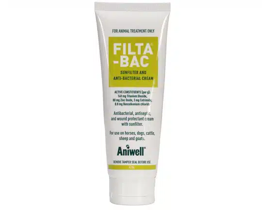 Filta Bac is a versatile, protective cream designed to provide effective sun protection and antibacterial relief for sensitive or damaged skin. This multi-purpose cream acts as an antibacterial, antiseptic, and wound protectant, helping to soothe and heal a variety of skin conditions. With its built-in sun filter, Filta Bac safeguards against harmful UV rays, making it ideal for use on horses, dogs, cattle, sheep, and goats. Whether treating wounds, preventing infection, or shielding from the sun, Filta Bac is a reliable choice for animal care.