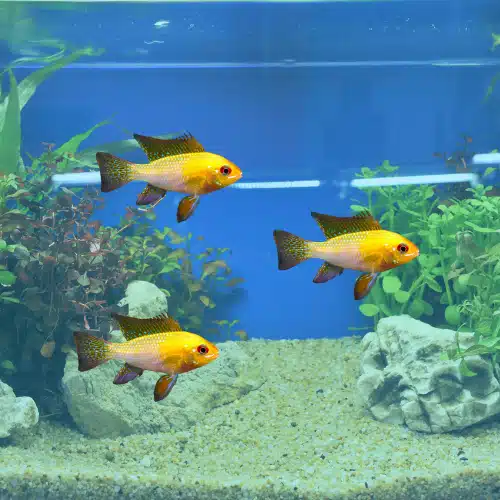 Gold Rams form monogamous pairs and spawn on flat surfaces. Provide smooth rocks or broad-leaf plants for egg laying. After spawning, parents guard the eggs, which hatch in 2–3 days. Feed fry with infusoria or finely crushed flakes.