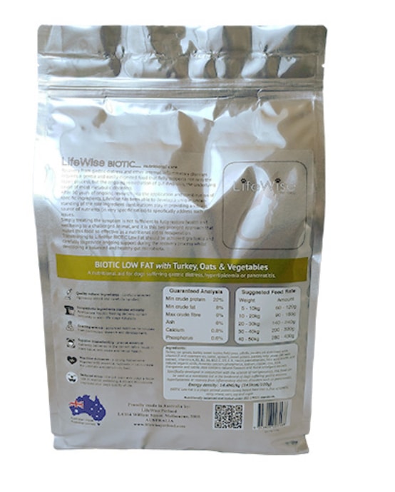 LifeWise Biotic Low Fat Turkey, Oats & Veg 2.5kg is a nutritionally balanced, low-fat dry dog food designed for dogs requiring digestive support, weight control, or recovery from pancreatic stress. This formula features lean Australian turkey as the primary protein source, supported by whole oats and a variety of vegetables for slow-release energy and gentle digestion.